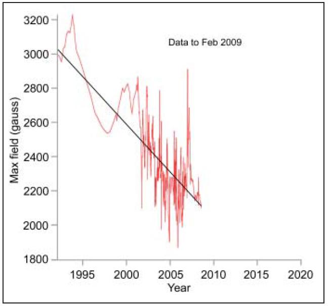 あれから3年あまり、今年(2009年)EOS誌の7月28日号に彼らによる続報が掲載されている。ここで彼らは現サイクルで見られる黒点は小さなporeがほとんどであり、観測結果は数年前に彼らが論文で予測した範囲内に留まっておりこのまま単純に直線を外挿すると2015年には磁場の強さが1500 Gまで低下し、黒点が消滅する可能性を指摘している。(図の直線を1500 Gまで延長!)つまり、世間では「異常」と騒がれている現在の太陽活動の低下も実は彼らの観測結果からは想定の範囲内であるということである。