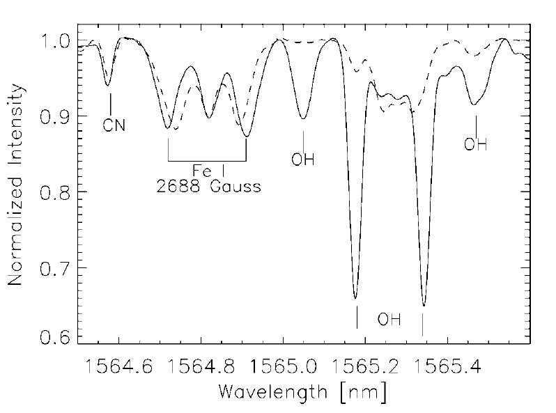 図は代表的な結果である。実線が1998年9月18日、点線が2005年12月27日のものである。1998年9月18日の観測では波長1564.8 nmのFe Ⅰの吸収線はZeeman splittingを起こしている。この間隔から磁場の強さが2688 Gと推定されている。それに比して2005年12月27日の観測ではZeeman splittingの間隔は狭くなっており、時間とともに磁場が弱まっていることがわかる。(つまりこのsplittingの程度からumbraの磁場強度が推定できるということである)これを1年ごとにまとめたのがリンク先の論文のFig.2である。彼らによればumbraの磁場は1年に52 Gずつ減弱しているとのことである。