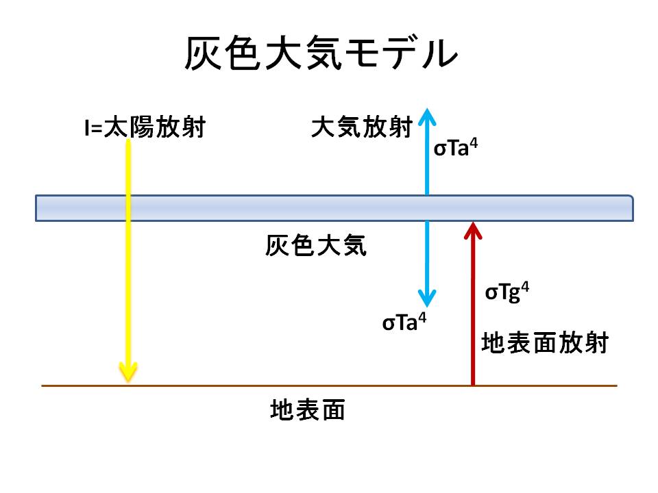 灰色大気モデルとは惑星の上空に太陽放射はすべて透過させるが、地表面からの赤外放射をすべて吸収し再放射する仮想の大気層を考えたものだ。(図1)